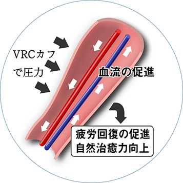 VRC駆血法は、血流を速やかに止め、一定時間後一気に回復することで行われます。VRCトレーニングは、脈動常時装置を使って、静脈還流血を適切に抑制した状態でのトレーニングのことです。